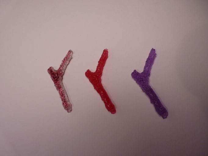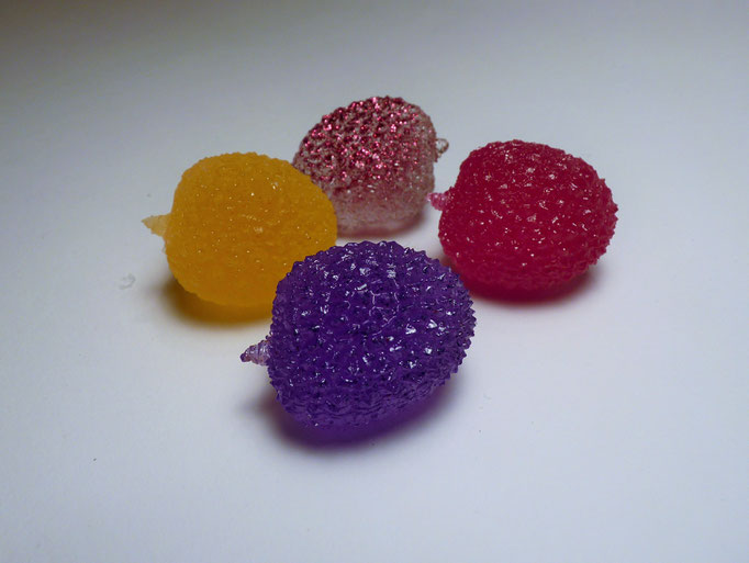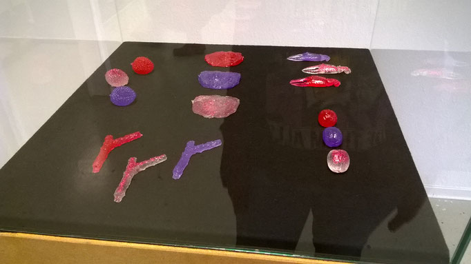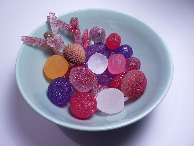 Diese Objekte, sowie die Krebsscheren bestehen aus Epoxydharz und sind Gegenstände aus der Natur (Ast, Litschi, Walnuss), die zu künstlichen Objekten umgewandelt worden sind. Ihre Natürlichkeit wird nur noch von der Form definiert, der Rest hat nichts mehr mit dem Ursprungsobjekt zu tun, was durch die grellen Farben und der Glitzer in einigen Stücken unterstrichen wird.
