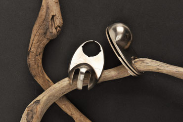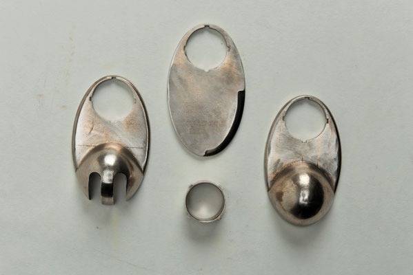 Löffel, Gabel und Messer sind Teil der Kombination, ebenso wie ein Ringelement, das in seiner Größe austauschbar ist, somit an jeden Finger passt und gleichzeitig dazu dient, das Besteck beim
